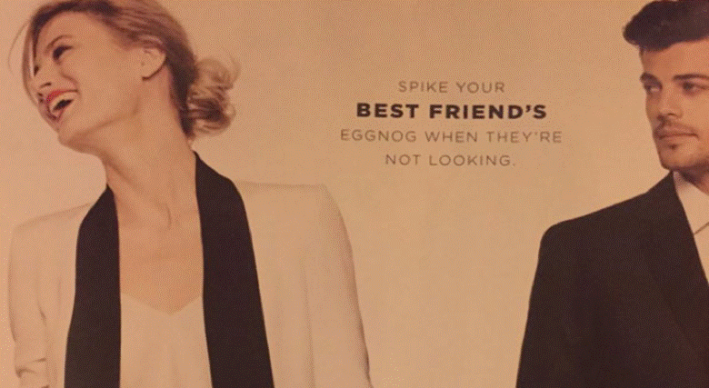 The layout in question depicted a man gazing at a woman who is blissfully unaware, and the two were separated by a caption that read, "Spike your best friend's eggnog when they're not looking." Sketchy, right?