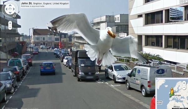 This seagull invading the shot taken by a Street View camera in John Street, Brighton, England, is yet another way in which things can be made to go slightly askew in the Googleverse! Hilarious! The bird, complete with food in beak, quickly became a star in 2010 as Google's problems with their vehicles being mobbed in Europe continued.