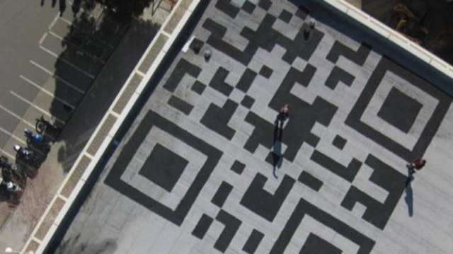 A truly audacious hack from the big G's rival for dominance on the online display ad market, it won't be long before the giant interactive barcode makes its way onto Google Maps, possibly paving the way for the service to be overrun with similarly scan-able free pieces of promotion. In the end, all you need is a big pot of paint, a large roof, and some willing hands.