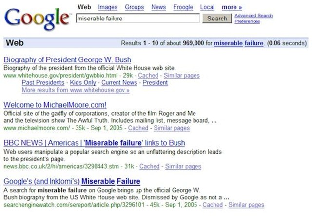 Back in 2006, if you entered the words "miserable failure" into Google's search engine you would have been greeted by a strange result: a biography of the then-President on the White House's official website. Another piece of political Google bombing, it was an example of the practice that truly captured the world's attention - though Google later algorithmically "defused" the bomb that made it look almost as foolish, if not quite as much of a failure, as "Dubya" himself.