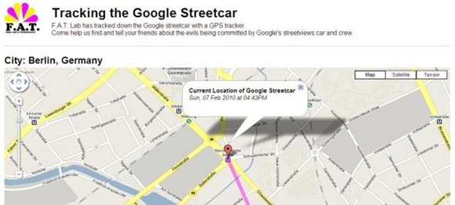 Members of the art and open source media group Free Art and Technology (FAT) took their arguments to the source in early 2010 when they stuck a GPS tracking receiver to a Google Street View Camera Car in Berlin. Or said they did.