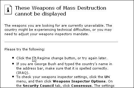 The landmark "Google bomb" makes its point eloquently clear. Searching for the words "weapons of mass destruction" returned the pictured prank page (pictured) as the first result, taking web users to the brilliant parody of the browser error message. Created by English pharmacist Anthony Cox in 2003, the spoof 404-error page went viral and, thanks to the work of bloggers linking the offending keywords to Cox's site, tricked Google's page rank algorithm into "thinking" the prank page was the most relevant result for the search query.