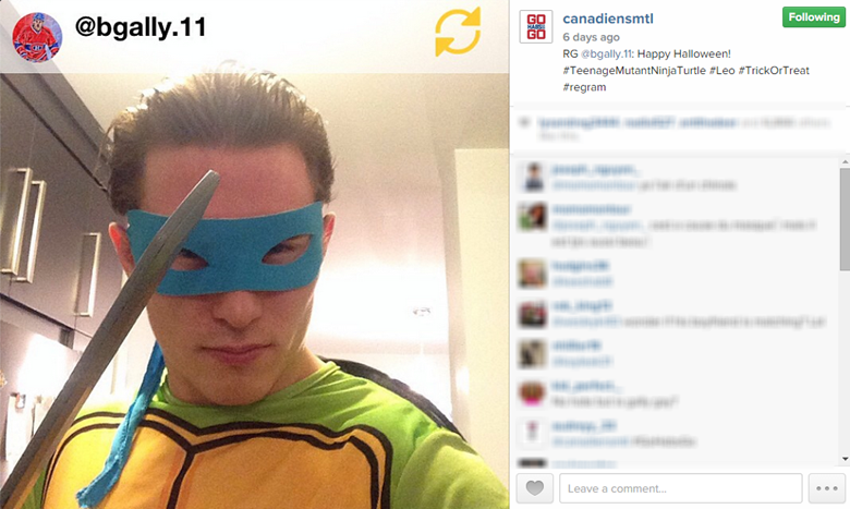 The Montreal Canadiens got creative with one of their recent posts. They reposted team member Brendan Gallagher's photo of himself dressed up for Halloween. This is a fun way to break up all their other posts about their games, practices and the NHL itself.