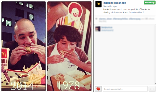 Here is a great example of a repost. McDonald's Canada has reposted a photo from a follower eating one of their burgers over 30 years ago and today. They have also tagged the user using their Instagram handle and thanked them for sharing.