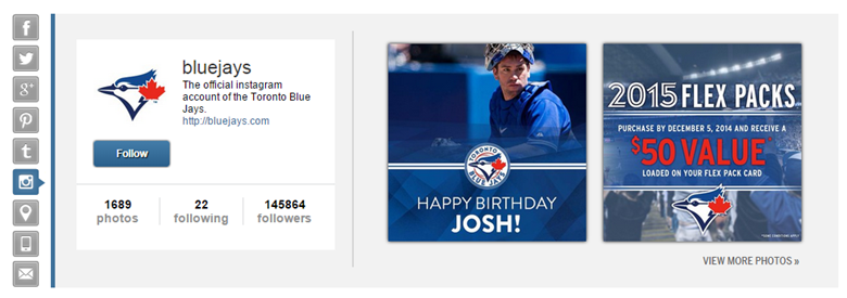Here, the Toronto Blue Jays have done a great job of displaying all of their social media channels. Users are able to click each of the buttons on the left, and the Blue Jays' account will show up with the option to follow or like the page. By clicking each channel, the user is also shown some of the most recent photos or posts on that specific channel.