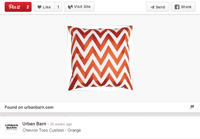 Even though posting photos that aren't their products (or have nothing to do with their company) can be good for driving traffic, the board wouldn't be as effective if it didn't include some of Urban Barn's products as well. Pictured here is a throw pillow that can be found on their website. They have also included a link, which allows customers to purchase right away if they wish.