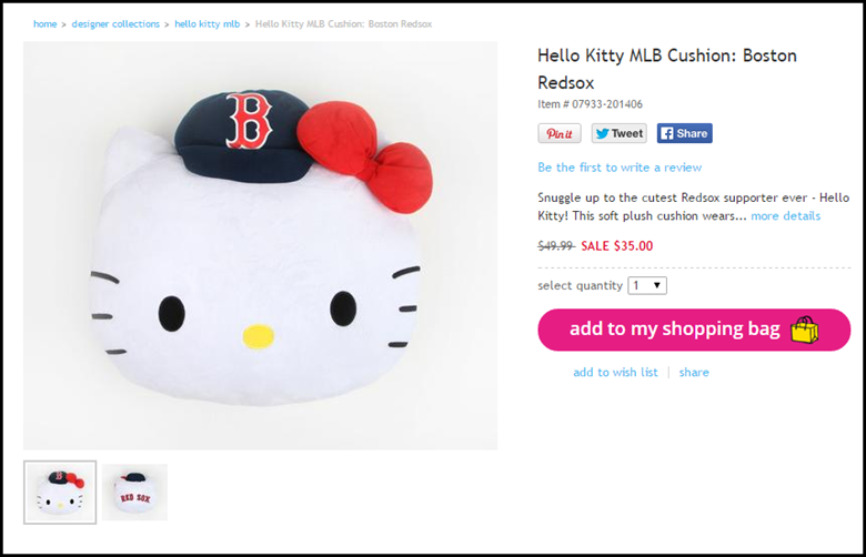 Here, the Hello Kitty official site has the option for users to "pin" this plush pillow. When users click on the "Pin It" button in the top image above, they are immediately redirected to a screen (in a separate window or tab) with the options seen on the lower image. The user can then choose which of their Pinterest boards they would like the image to go on, and add a description. The great thing about this is that the user never leaves your webpage, so they can continue to browse your products.