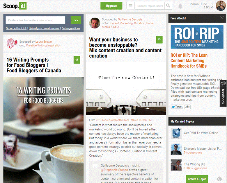 These days, many social media tools try to be all things to all people, so you can get content sharing recommendations on Klout and Buffer, and Scoop.it's home page also helps with this. Swayy is purpose built for this function. These sites combine the data they have on your network and usual topics to suggest other people's content you might want to promote.