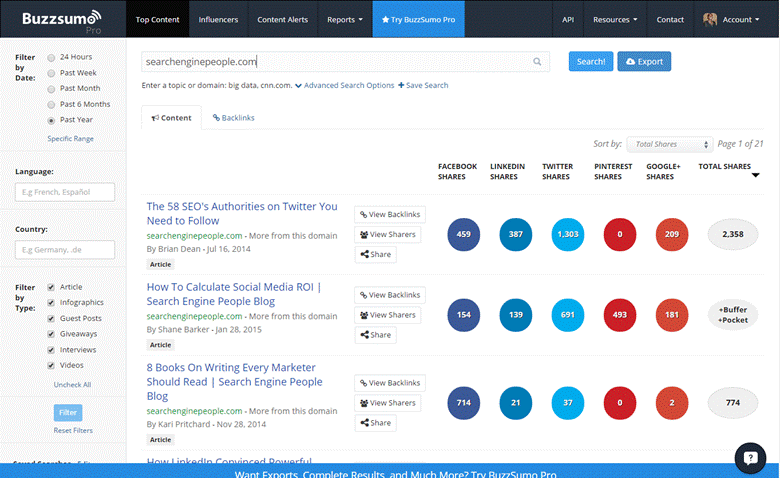 Not only does Buzzsumo tell you what's popular now, but the data it provides can help you predict the future. After all, if a topic is consistently popular, it's a fair bet that sharing additional content on that same topic will help raise visibility for your business.