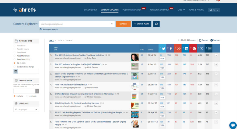 Fortunately, the tool Buzzsumo exists for that very reason. It enables you to track the virality of a competitor's content. Simply type in the domain name of a competitor and see which content on the website is getting shared the most. You can also filter those results based on the timeframe or the type of content (articles, infographics, etc.). The app will show you a list of posts on the site and relevant social shares from Facebook, Twitter, Pinterest, LinkedIn, and Google+. Buzzsumo is free to use a limited number of times per day, or you can sign up for unlimited searches.