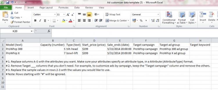 Now you have to make sure that the information you're inputting will be pulled into the right ad for the keyword, ad group, or campaign. Look at columns F to H - these columns are where you should be putting in all the targeting information. This is where you instruct the spreadsheet to apply the data you put in for the basic attributes from A to E (price, model, sales end date, etc.) to a particular ad group, campaign, or keyword. For example, if you've grouped all your ad groups by brand and want to apply all the same customizers to all models you offer within that brand, then just add in the customizers and state that this particular ad group is the target.