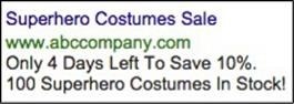 Here is the Superhero ad again, but this time with a countdown (urgency) and an inventory count (scarcity) added, and the starting price removed (the ad texts are infinitely customizable). The first is as the ad appears to us, and the second as the ad appears to customers searching for superhero costumes: