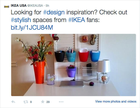 Here IKEA is just displaying how creatively real customers use their products with the help of an image. This was a real smart move and an effective social media strategy as tweets that have images are 94 percent more likely to generate retweets. In addition, IKEA used hashtags pretty well here without overdoing it, keeping it to three hashtags. Finally, this global furniture retailer used a clear call to action along with a link, giving a clear instruction to its followers.