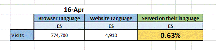Me: Hi David, check what we found in the last analysis. In April 2016, we had 774,780 Spanish speakers (browser language is Spanish). Only 4,910 were able to see the Spanish content. That’s 0.63%. Here the data: