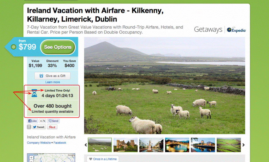 Good examples of scarcity can be found on Groupon. It is a deal site offering huge discounts on various products and services. The website uses limited time and quantity tags, and a small hourglass image. It develops a sense of urgency and scarcity to encourage consumers to make a purchase before they miss the opportunity.