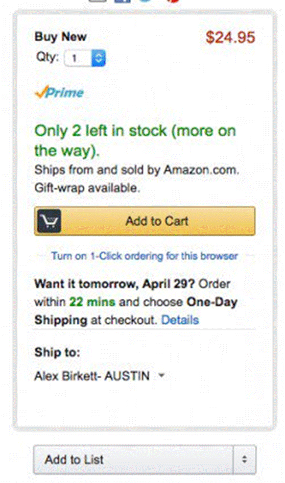 Amazon also uses the scarcity principle really well. In the image below, you will noticed a bold, green highlighted tag, “only 2 left in stock.” In this case, the limited number of the item is combined with the urgency of a limited-time, one-day shipping offer. This is one of the most effective ways of pushing customers to take actions.