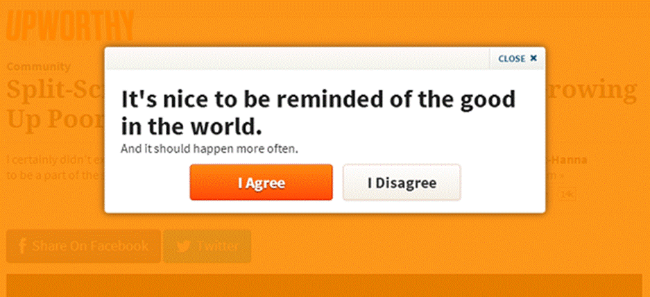 Upworthy is a startup devoted to publishing uplifting stories that go viral on social media. When you visit their website and start to read an enticing story, a pop-up window comes up. The pop-up window shows messages like “I support equality for all,” with an agree and a disagree button below it. Now you would probably think that clicking “agree” won’t be of any harm and click it.