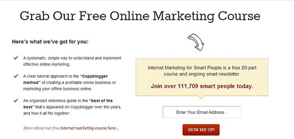 Brian Clark is the founder of Copyblogger, which sells content marketing software. On the website’s homepage, after scrolling a bit down, you’ll notice a huge headline. The headline invites visitors to capture the opportunity for a free online marketing courses from the company.