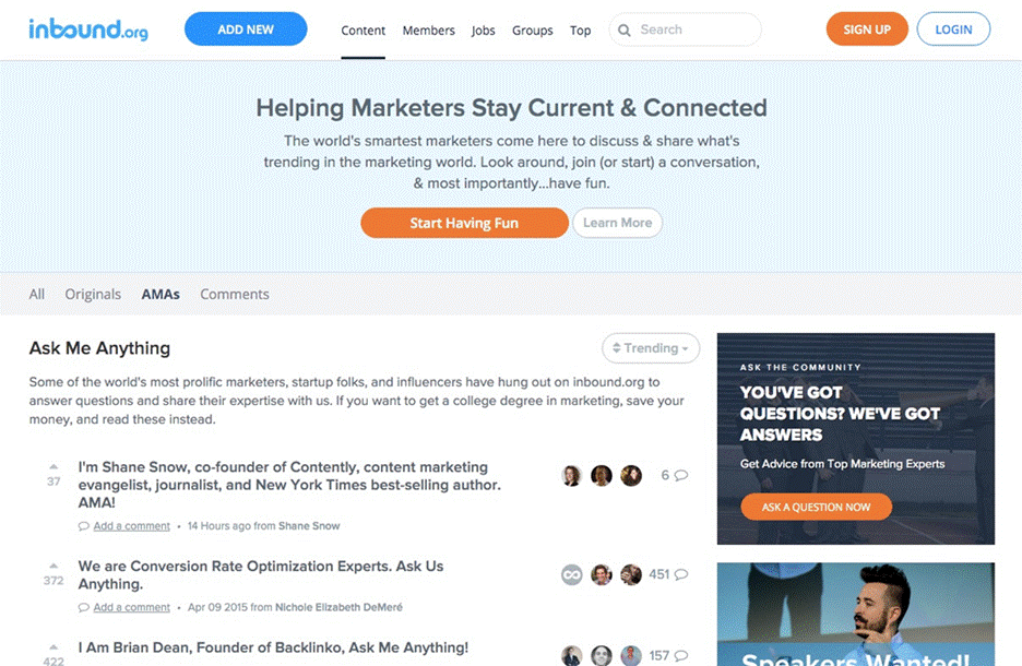 To promote yourself and your expertise, you can conduct “ask me anything” (AMA) sessions at regular intervals or times. You can participate in communities who organize them regularly if you cannot do it all by yourself. There are many online marketing expert agencies that participate in AMA sessions organized by Inbound.
