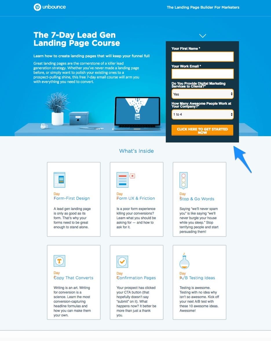 Unbounce, for instance, uses a simple, minimalist design for its lead generation landing page course.