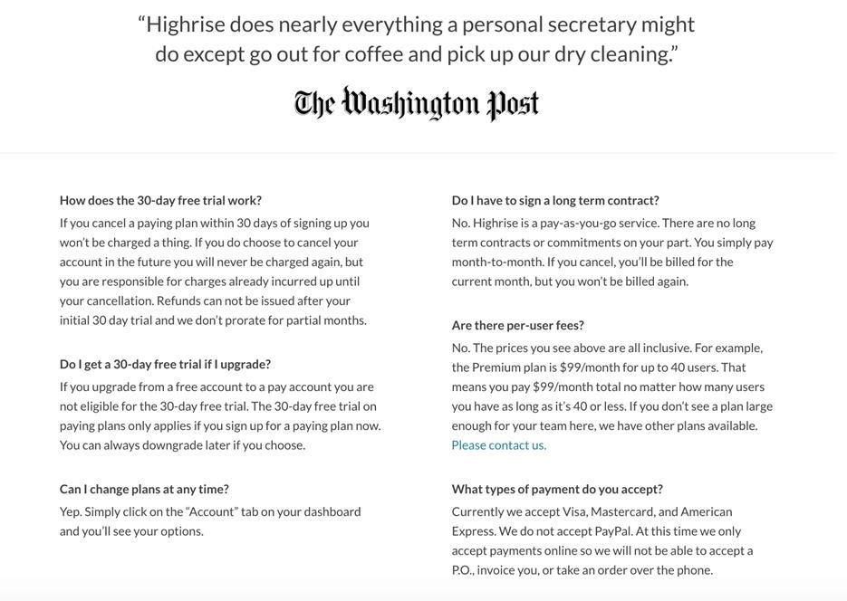 Along with explaining everything about the product's pricing and features, Highrisehq also has a FAQ section answering questions about the purchase, making the picture clearer, and bringing down all the barriers that may stop the readers from purchasing.