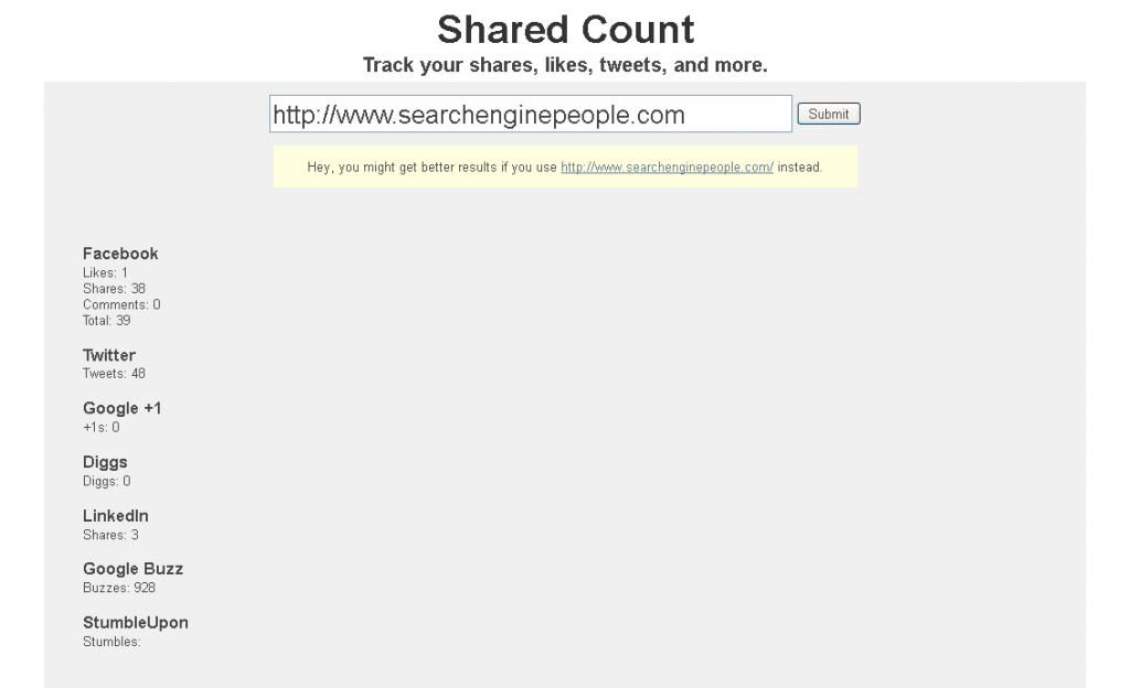 Shared Count will give you social media activity breakdown for any domain - Tweets, Likes, Google +1, LinkedIN shares, Diggs...