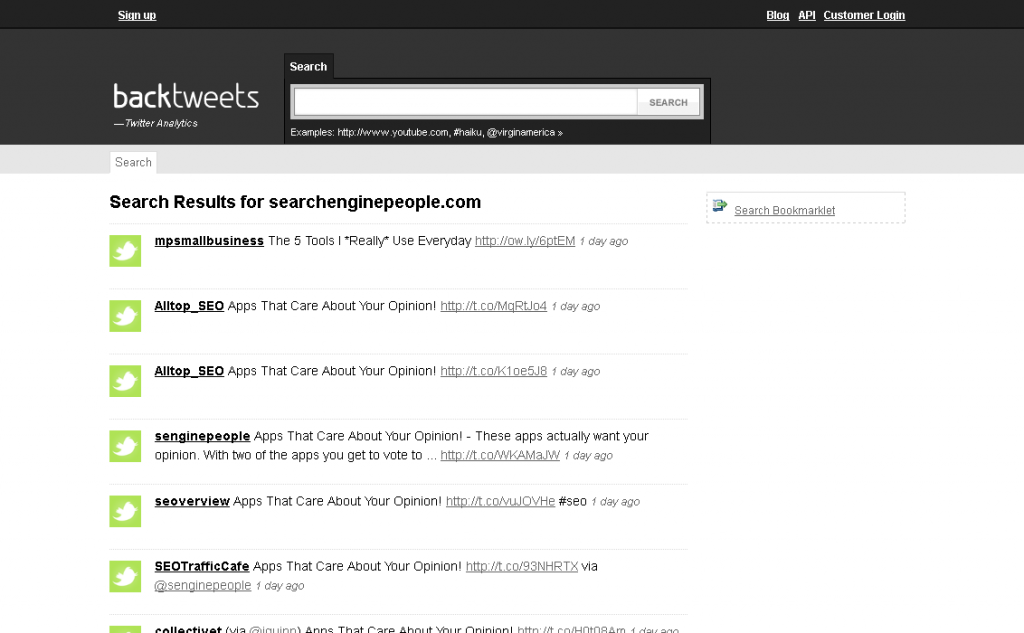 Backtweets finds all tweets mentioning the given domain, great for monitoring your own or competitor's brand.