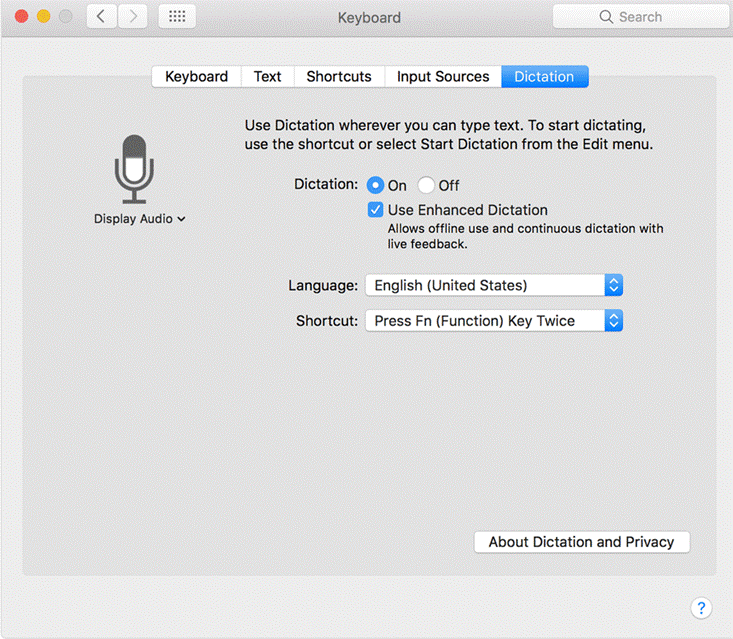 From here, you can turn on Dictation and fill in the rest of the needed information, such as language preferences and keyboard shortcut.