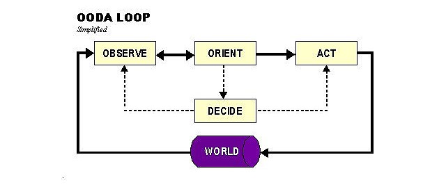 Originally conceived by a USAF Colonel, John Boyd, as a conceptual frame work for processing information and acting on it, the framework has four distinct phases; observe, orientate, decide and act. This works surprisingly well in any other information rich environment where the conditions continue to change in response to your own and others activities.
