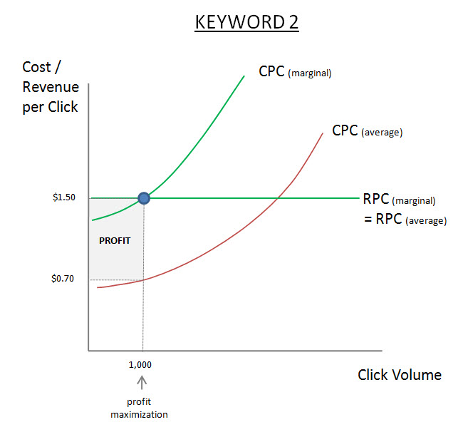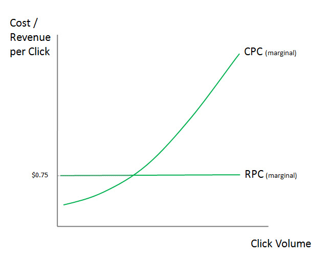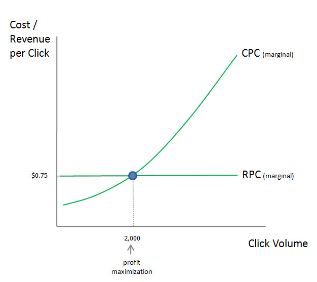 Look at where the two lines cross. This is the level (2,000 clicks) where the advertiser will make the most profit from this keyword. If the click volume is any higher (say 2,500 clicks), the cost per click will be higher than the revenue per click that the each extra click generates. The 2,500th click may be costing $0.90 and only generating $0.75 in revenue, so the advertiser is making a marginal loss. Reducing click volume would increase profits.
