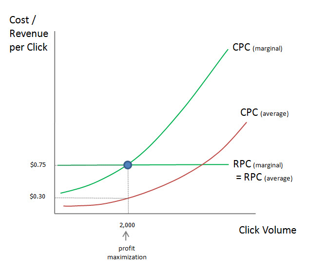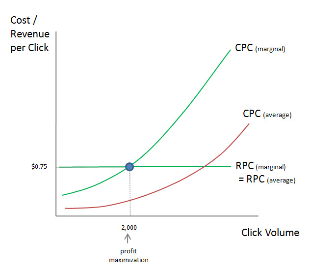 On the other hand, if the click volume is any less than 2,000 clicks, the revenue per click of an extra click ($0.75) will be higher than the cost of that extra click (e.g. $0.60). Raising click volume would increase profits. The point of profit maximization is therefore where MC = MR (the blue dot where the two lines cross).