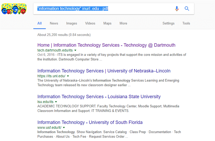 Step 2. Type “information technology” inurl:.edu -.pdf