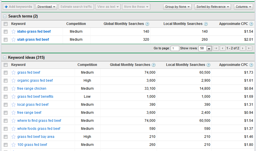 There are two main ways to use this tool. First, in the "Word or phrase" box you can enter keywords that you think your customers will be searching. For this exercise we'll use my dad's grass fed beef as the example. He's a rancher in Idaho and sells his beef directly to consumers in Eastern Idaho and Utah, so we'll type in "idaho grass fed beef" and "utah grass fed beef". The second option would be to put a website directly into the tool and let Google tell you keywords it thinks would be relevant to the site. You can put your own site in or you could put in a competitor or popular blog to see what keywords Google feels are relevant to their site. Here is what you'd get: