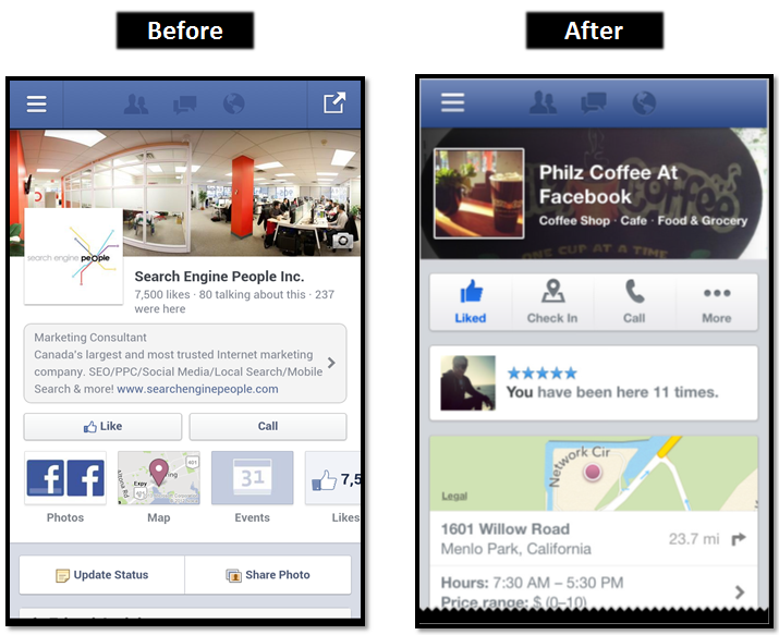 The new layout is optimized for engagement. Businesses need to keep a close eye on the new top navigation bar: Call, Check-In, Message and Like are more prominent than ever, and every cover photo doubles as a description, and has a profile picture within it.