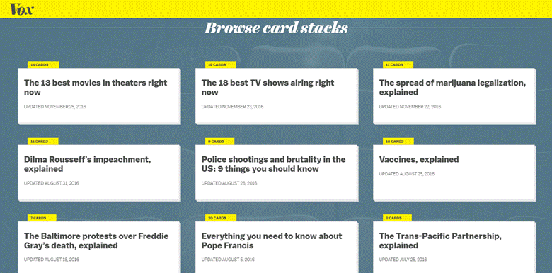 We will also see large brands and publications switch to bite sized sharable infographics, visuals and videos in innovative formats. Vox is already doing it with their cards.