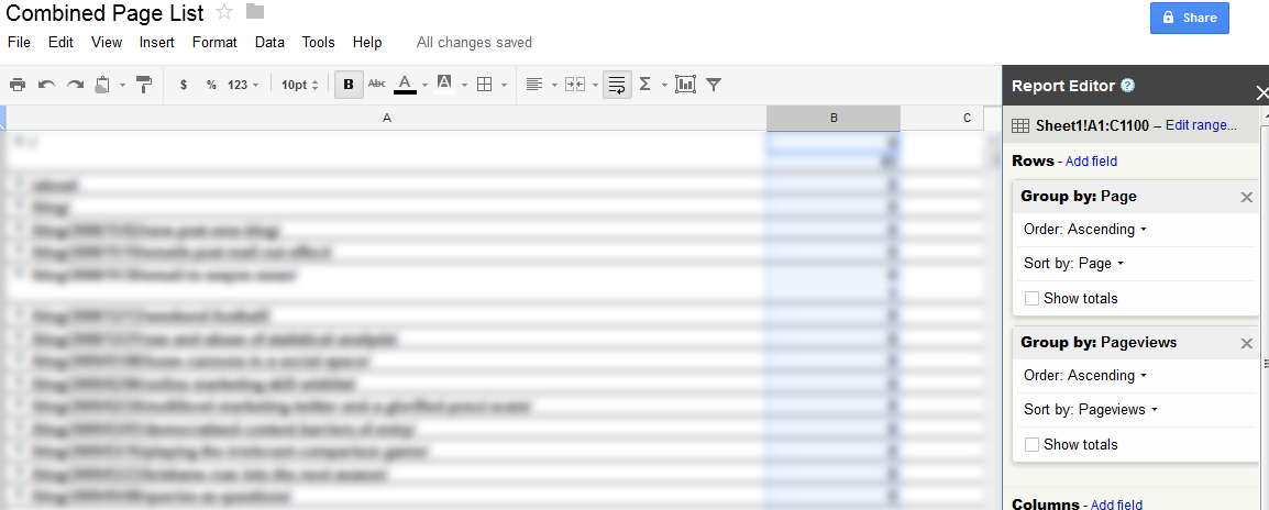 Once this list is complete, create a pivot chart with the pages as the row and pageviews/metric of your choice in the data area. Excel will ignore duplications of the pages and return a list of all the site's content, with and without activity data.