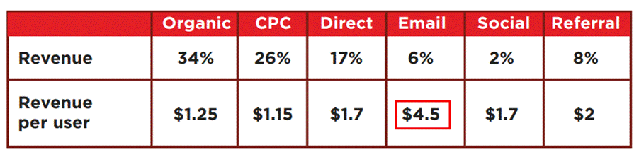 This is still one of the most efficient digital marketing channels for reaching an audience of online store customers. We have found out that it has 2.25% conversion rate, which is higher than any other digital marketing channel. Another interesting thing is that email marketing demonstrates significantly higher revenue per user.