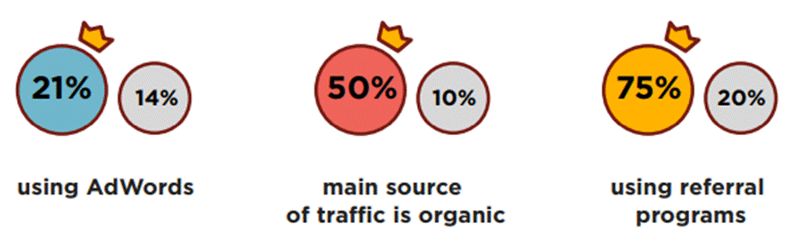 Based on available data, our experts identified a successful ecommerce as a website that increased its profitability by 30%+ over the last year. The share of AdWords in total traffic of the successful projects is more than 50%. They also have used a wide range of referral programs constantly. Check out the following infographics showing data that compares successful to less successful websites: