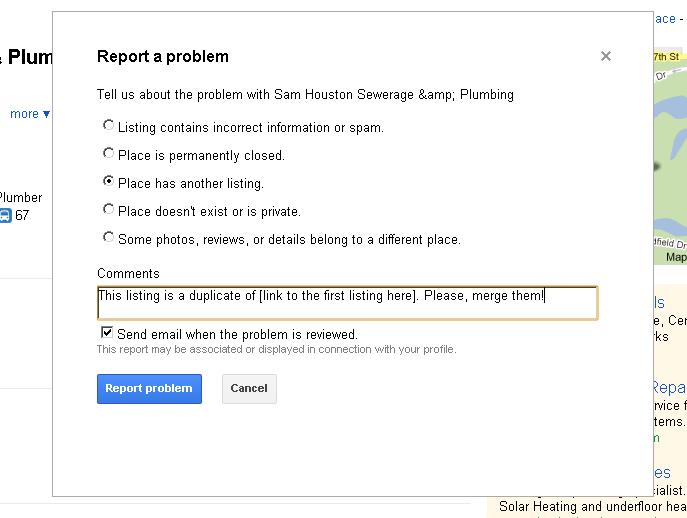 - Go to the duplicate listing and click on "Report a problem" at the bottom