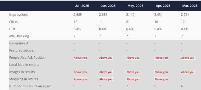 The “10 blue links” era is ending. Our ranking monitors show that for rich SERPs, Google sometimes displays only 7 organic links. Ranking #8 doesn’t even guarantee a spot on page one anymore.