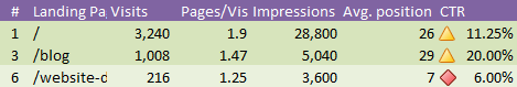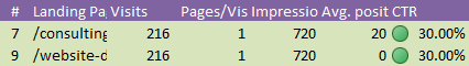 Observation. Best converting pages are #7 and #9 judging by the click-through rate. Unfortunately, #7 page is stuck on the second page of SERPs and #9 is not even ranking. Moreover, visitors usually view just one page on your site, which means those pages are not "sticky".