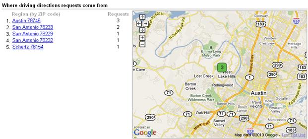 Besides the impressions and actions analytics that Google provides in the dashboard, for business in US it also gives reports of Where driving directions requests come from. See the picture below where Google gives the report with city names and zip codes along with the number of requests.