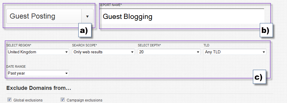 c) Choose your report specifics (if it is country specific, TLDs, date range and the scope and depth of the prospecting - I recommend not setting the depth too big unless you are looking for thousands of potential prospects, it can become a little daunting). You will also want to set some global exclusions so that the tool doesn't report prospects on Google, Facebook, Amazon and other big sites that are of no interest.
