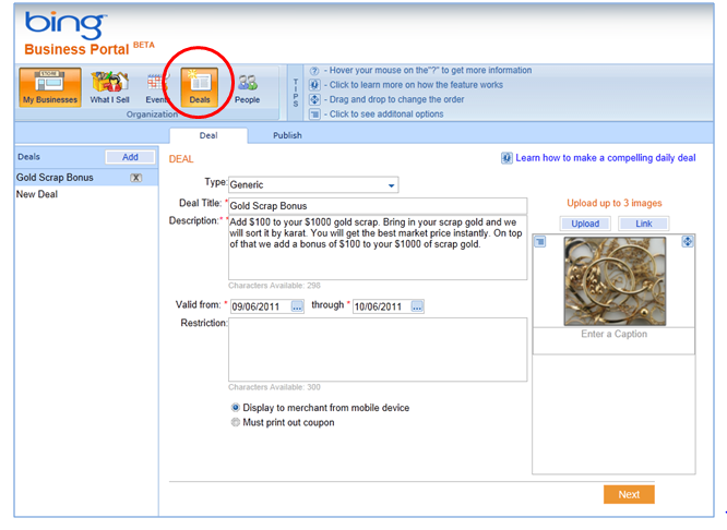 Consumers love a good deal " I certainly do. Deals are special offers that businesses promote to gain new and existing customers. With Bing Business Portal you can get creative and easily create a discount coupon, promotion or rebate using their Deal Editor wizard. You can create and manage deals from the management page of your business listing. Simply select an offer category, whether it is a dollar amount, dollar off or percentage off, add a description, photos, offer period and restrictions from within the tool. Once created, your deal will appear in your listing results on the Bing desktop and on Bing mobile.