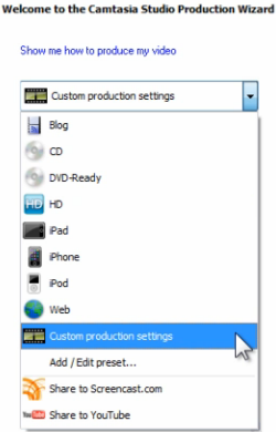 So, to enter the Production wizard, just click on Produce and Share and select the Custom production settings.