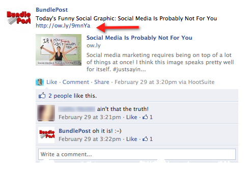 Note the shortened link used above. Even with adjustments made by Facebook, the shortened links are not recognizable to the average Facebook User. BundlePost caters to social media professionals, so it works well for them.