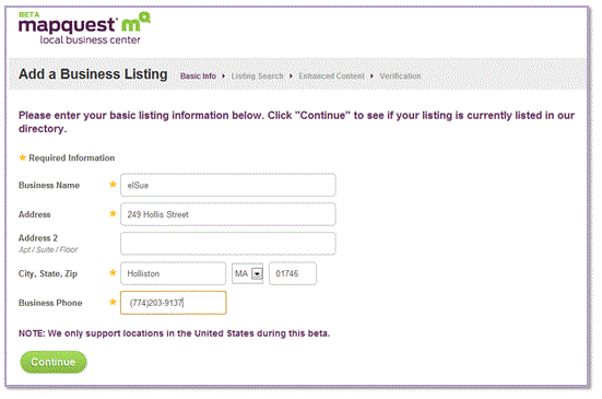 When our listing goes live, I will write another post showing our listing and hopefully, a dashboard like Google Places where you can monitor analytics and maintain your listing. If you have a MapQuest business listing that has been published, please share it with us. Thank you!