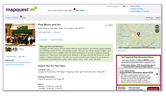 I was hoping to show you the end result of elSues MapQuest business listing. Since we are awaiting verification, here is an example MapQuest business listing, Play Music and Art, from a blog post about the MapQuest Local Business Center, written by sonjalowe at MapQuest.