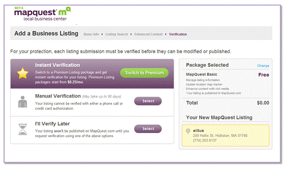 Heres where it gets interesting. If you want instant verification, you need to purchase one of their packages starting at $8.25 per month. If you want the free listing, verification can take up to 90 days " OUCH! I was a little surprised. It was my understanding before I started that verification was by phone or credit card and my listing would be up within minutes. Perhaps, its because Im adding a new business.