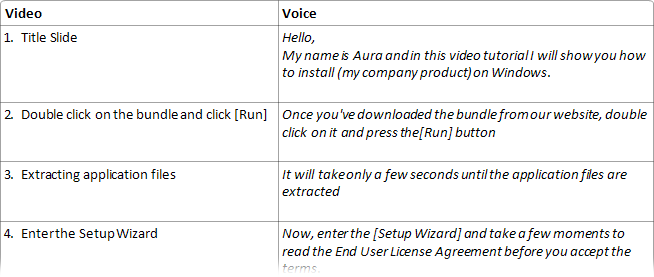 On the left side, I included brief notes on what I planned to show on the screen, and on the right side I added the text for what I would say while recording the actions.